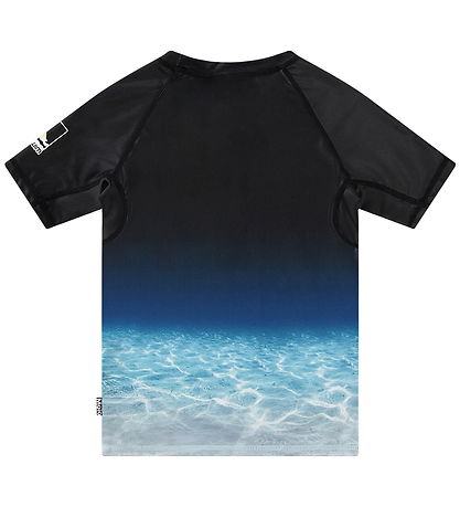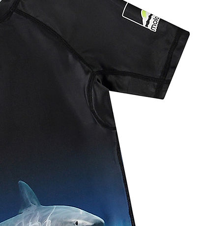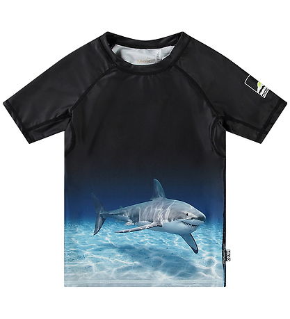 Smart Molo swim top with a gradient colour from black to blue and a print of a large shark. The Swim tops has a round neckline and short sleeves.