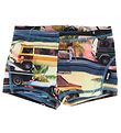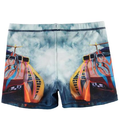 Beautiful Molo swim trunks in blue with a print of a cool car in orange.