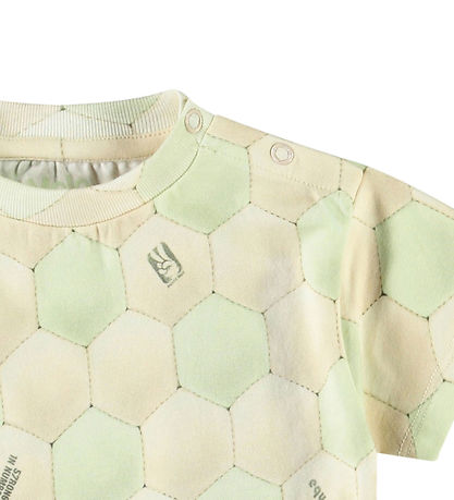 Charming Molo t-shirt with a unique pattern of hexagons in a combination of light yellow and green shades, reminiscent of the pattern on a football. The T-shirt is decorated with small print that add an interesting design. The Molo t-shirt has a round neckline with a narrow ribbed edge and practical push buttons on the shoulder, making it easy to take on and off.