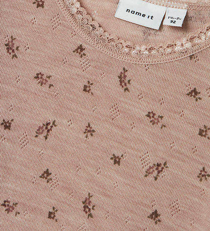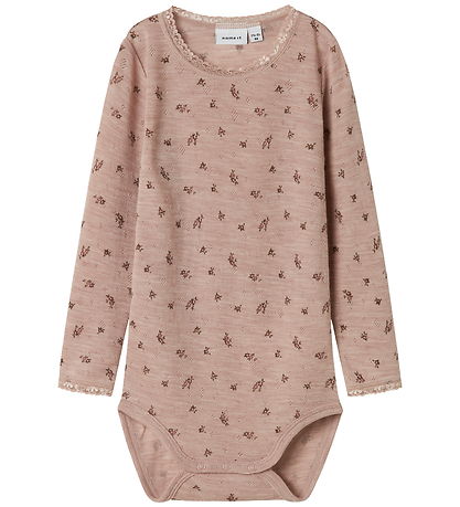 Charming Name It bodysuit with long sleeves in a warm pink shade. The Bodysuit is made of lovely, soft merino wool and is decorated with a fine floral print that creates a sweet expression together with the discreet pointelle. The Bodysuit from Name It has a practical closure at the bottom that ensures easy dressing.