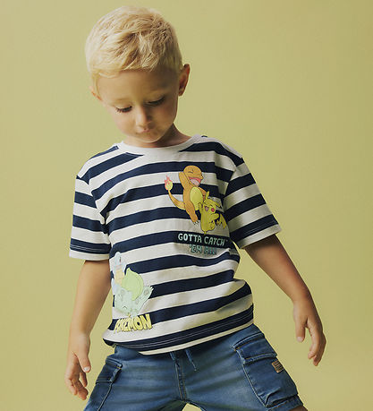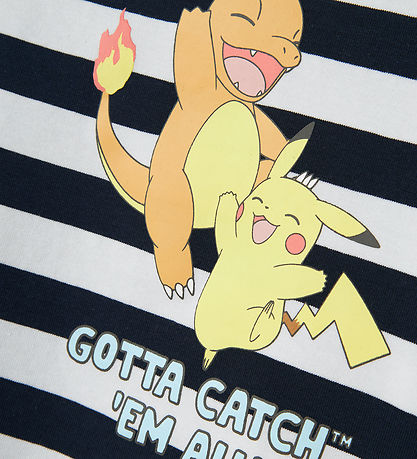 Beautiful Name It t-shirt with black and white stripes and a colorful Pokémon print on the front at the left chest and at the right hip. The Name It t-shirt has a classic round neckline with a ribbed edge and short sleeves.
