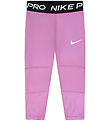 Stylish Nike leggings in purple with a wide, black elastic edge waistband with the text "Nike Pro" printed in white.