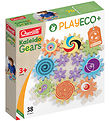Fun Quercetti construction playset with colorful gears that can be rotated when placed on the puzzle building plate. The box includes:
