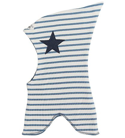 Gorgeous Racing Kids balaclava with a striped pattern in white and dusty blue. It has a navy-coloured star on the left side and a logo application on the front.