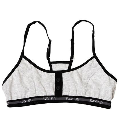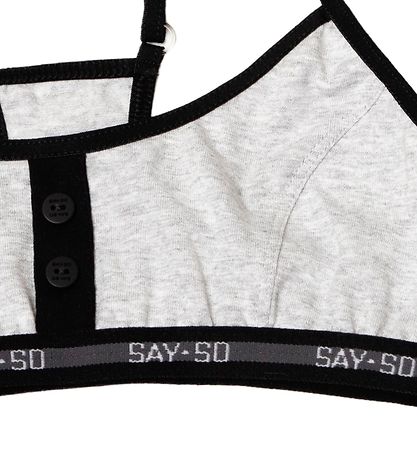 Beautiful Say-So top in melange grey with a black elastic edge at the bottom with the name "Say-So" all around. In the middle there is a black stripe with two decorative cheat buttons.