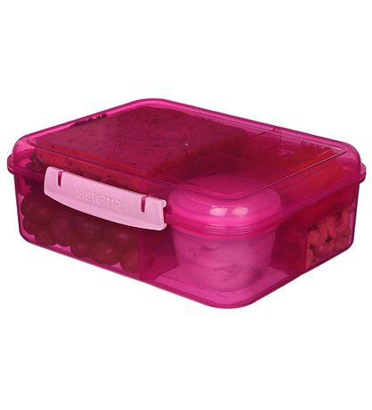 Delicious Sistema lunchbox in pink plastic, which has a maximum capacity of 1.65 l. Also included is a little, round container with a pink lid, which has a maximum capacity of 150 mL.