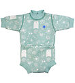 The Splash About neoprene suit is sleeveless and has wide shoulder straps. The neoprene suit opens with wide Velcro straps on the front and between the legs, making it easy to get on and off. It is made of 2 mm thick neoprene, which ensures that the little ones stay warm.