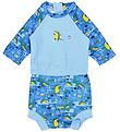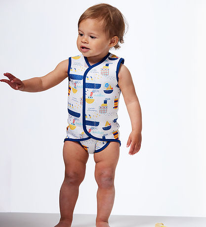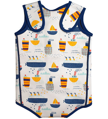 Cool Splash About neoprene suit in white, with a print of ships and waves etc. in a sea of colours all over. The edges are blue.