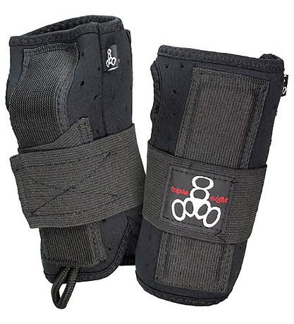 Beautiful Triple Eight wrist guards in black with a Triple Eight logo in red and white on the Velcro straps.