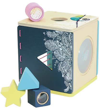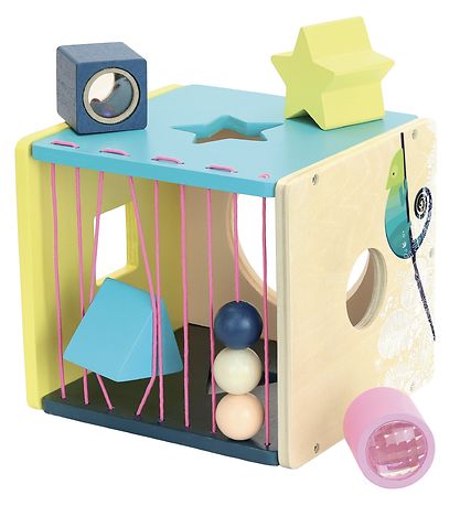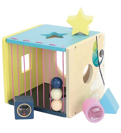 The Vilac shape sorter comes with rose elastics on one side, making it easy to get the pieces out, even for smaller children. The shape sorter comes with four different shapes, which fit in the four holes around the box.