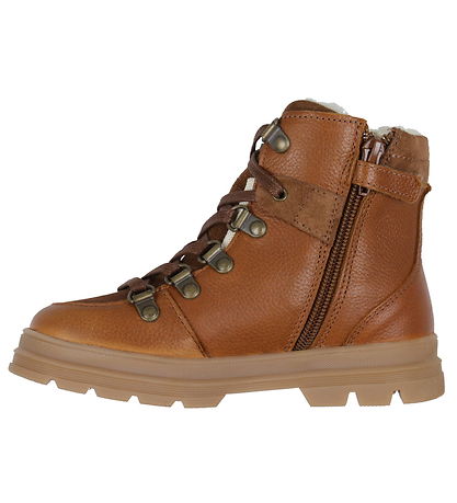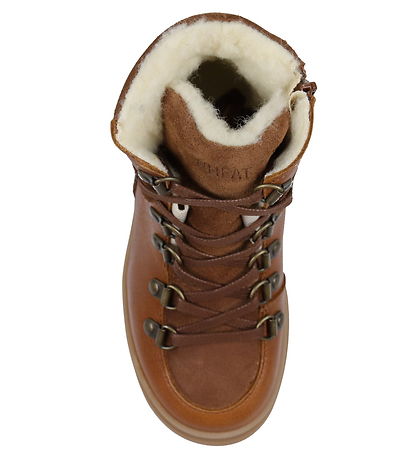 The Wheat winter boots are inspired by hiking boots. They close with shoelaces, and along the inside of the shaft they can be opens with a zipper. The Winter boots are lined with white wool and have removable insoles. The outer soles are strong and made of light brown rubber with a skid pattern, which ensures a good foothold.