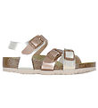 The sandals have two adjustable straps over the foot with buckles, as well as a strap around the heel. The straps are lined with felt, while the insole at the bottom is in soft blue and white striped leather.