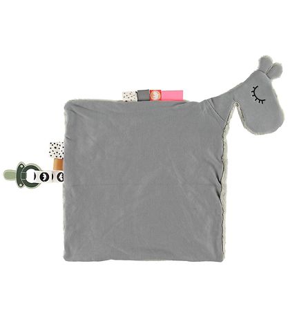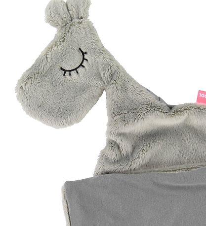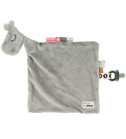 Lovely Done By Deer comfort blanket with a front of grey plush and a back in grey textile. The comfort blanket has a square shape with a giraffe head with closed, embroidered eyes.