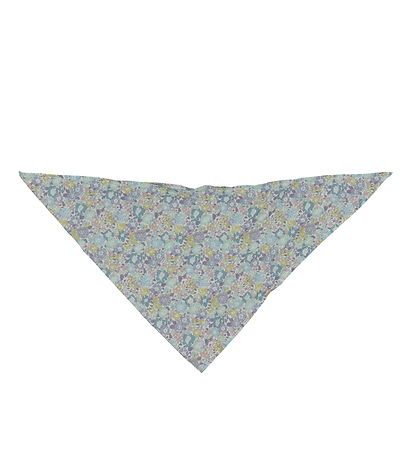 Beautiful GoBabyGo teething bib in white with an all-over-print of blue, yellow, pink and purple flowers.
