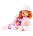 Nice Götz doll with a purple dress, a purple headband and a pair of trousers in white with a print of flowers. A pink dummy is included.