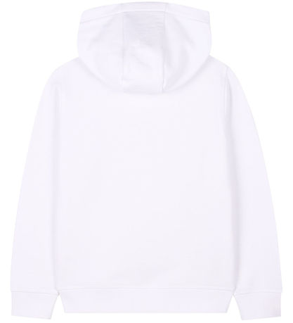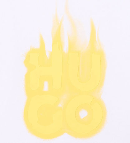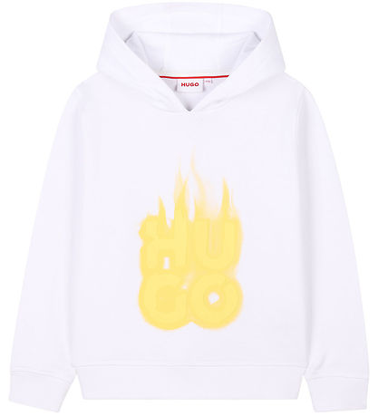 Smart HUGO hoodie in white sweatshirt, and on the front it says "Hugo" in large, yellow rubber letters that look like they're burning.