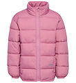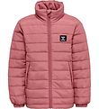 Lovely Hummel puffer jacket in shiny, dark pink with horizontal stitching and a black and white logo patch.