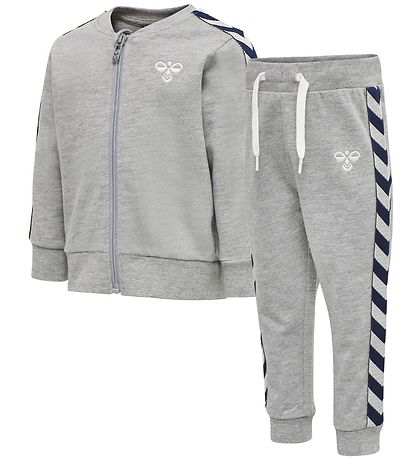 Beautiful Hummel sweat set, consisting of a cardigan and a pair of sweatpants. The set is grey with white and navy angles down the trouser legs and sleeves and on the left chest and thigh is embroidered a white Bumblebee.
