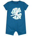 Nice Jordan summer romper in blue, with a large logo print in white and light blue shades. On the left sleeve is a little logo print in white.