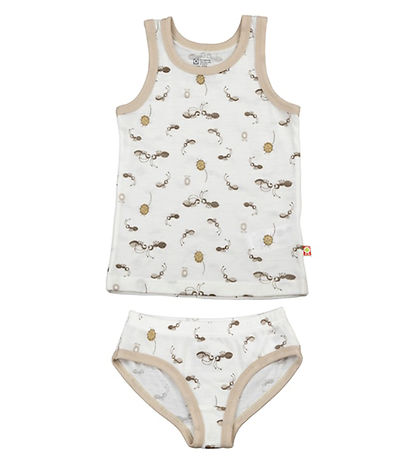 Beautiful Katvig in the form of an undershirt and a pair of knickers in white with beige ant print and edges. The Underwear has a comfortable fit and is perfect for play and relaxation. Give your child a fun and colourful experience with Katvig.
