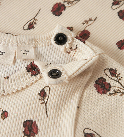 Charming Lil' Atelier bodysuit in off white with a print of red flowers. The Bodysuit is a tight-fitting model with a rib structure and cute stitching in all openings. It has a round neckline and long sleeves. The Bodysuit closes with push buttons at the left shoulder and between the legs.