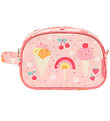 A Little Lovely Company toiletry bag has a square design with rounded edges. It consists of one large compartment which opens at the top with a zipper. The Toiletry bag has a practical strap at one end.
