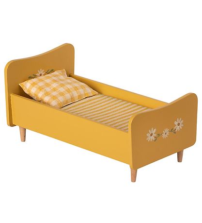 Sweet Maileg wooden bed in yellow and with white, hand-painted flowers.