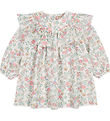 Elegant MarMar dress in beige with a fine floral print in pink, green and blue shades. The MarMar dress has long sleeves and an elastic, round neckline with ruffle details. The dress's light fabric falls fine and creates a classic look.