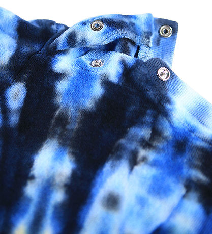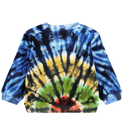 Colourful Molo blouse with long sleeves and a round neckline. The Blouse has an eye-catching tie-dye pattern in shades of blue, yellow, green and red. The Molo blouse's unique design adds a creative touch.
