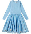 Cute Molo dress in light blue with a print of crocheted animals on the skirt. The Dress has a ribbed structure at the top and smooth woven, organic cotton at the bottom. It has a round neckline and long sleeves.