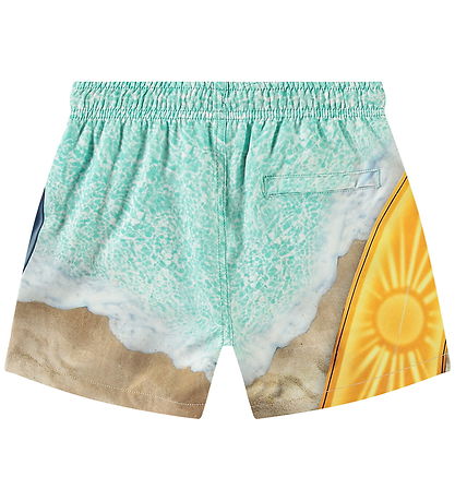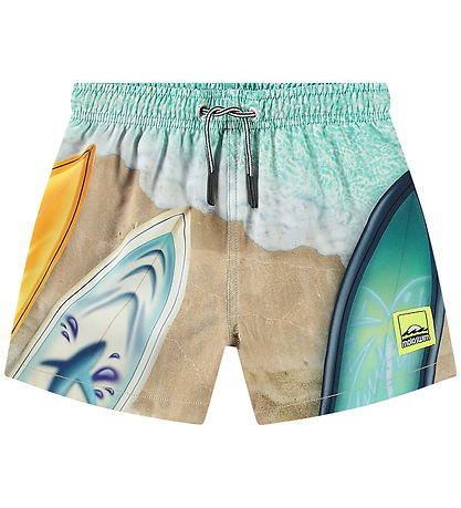 Beautiful Molo swim shorts in sand and turquoise with a surf print. The swim shorts have a good elastic at the waist that can be adjusted with a lace. Inside there is a net with elastic in the leg openings.