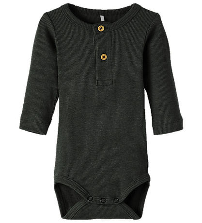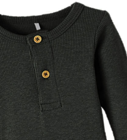 The Name It bodysuit has long sleeves and a round neck opening with a post-closure at the front, which opens with two buttons. In the throat and the leg openings there are narrow ribbed edges, and between the legs there are push buttons. The Bodysuit is in a soft and stretchable quality.