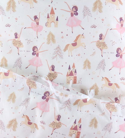 Beautiful Nørgaard Madsens bedding in white with an allover print of ballerina shoes, castles, unicorns and others fine motifs.