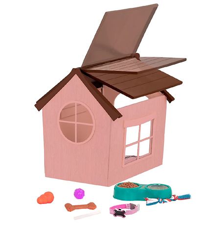 Lovely Our Generation dog house in rose with a brown roof.