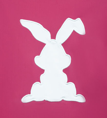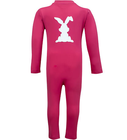Smart Petit Crabe coverall swimsuit in a deep pink with a large, white rabbit on the back.