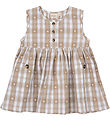 Smart Petit Piao dress with long sleeves in a light beige colour with fine stripes in light purple. The Dress has a nice frill at the bottom, which adds a playful touch to the classic design.