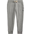 Smart Polo Ralph Lauren sweatpants in melange grey, and on the left side there is a brand shaped like a "P" in navy and green.