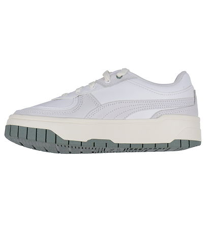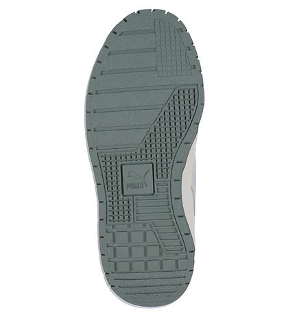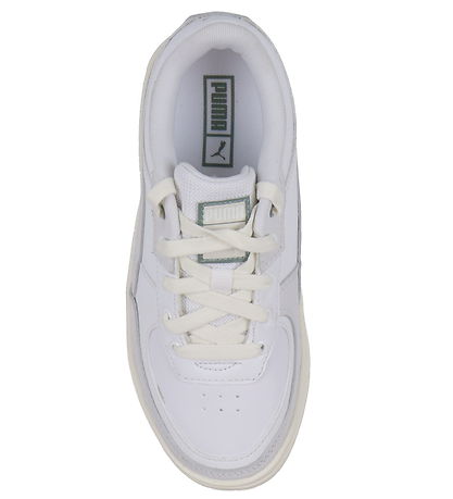 Beautiful Puma sneakers in white imitation leather and leather. On the shoe's heel cap, on the tongue and on the outside, there are Puma logos in dusty green.