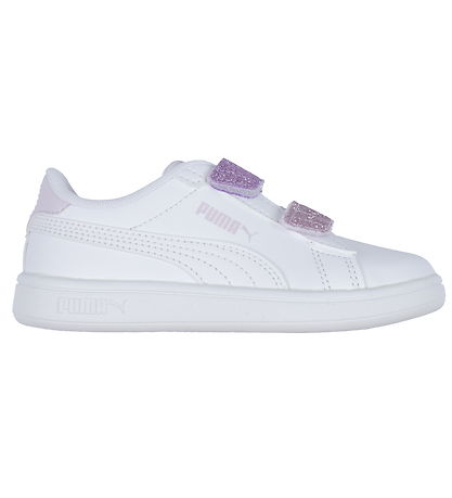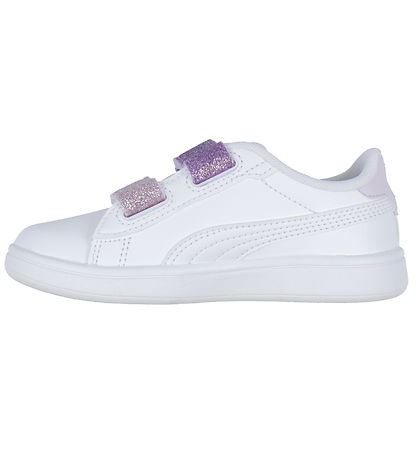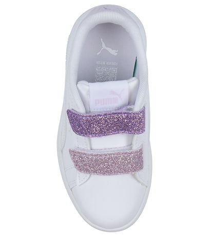 Fine Puma shoes in white, imitation leather with details and logos in purple and glitter.