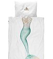 Sweet Snurk bedding in white with a print on the duvet of a fairy's body, and on the pillow is the fairy's flower crown, so it looks like the child is wearing the clothes.