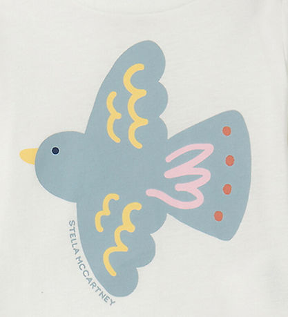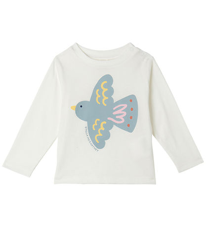 Elegant blouse from Stella McCartney Kids with long sleeves in white. The Blouse has a round neckline and push buttons at the shoulder for easy dressing. On the front there is a large, decorative print of a bird in blue, pink and yellow tones. Stella McCartney Kids' design combines simplicity with a playful motif.
