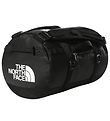 Cool The North Face travel bag in dusty, dark army green with black straps and details, and at the ends it says "The North Face" in black letters. The travel bag is made of a strong, coated, waterproof material, and the bottom is black and made of a durable quality.