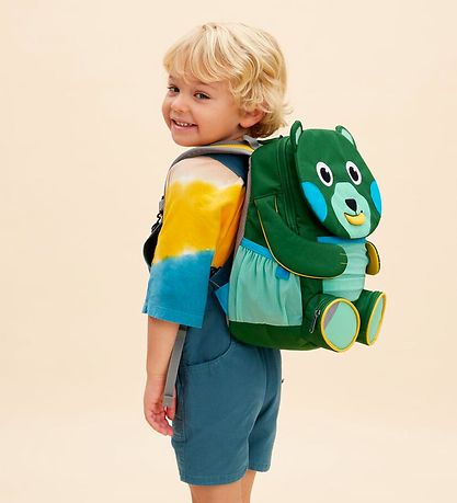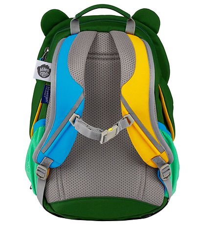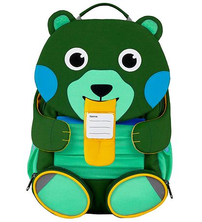 Cute Affenzahn backpack in shades of green, shaped like a bear. In front there are two large eyes, ears and a mouth that sticks out a tongue. The tongue is attached with an elastic band, and when you pull it, a name tag comes into view. On the sides there are hands that can be folded out and at the bottom there are small feet.