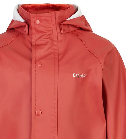 Fine CeLaVi rainwear, consisting of a rain jacket and a pair of rain pants in a beautiful red shade.