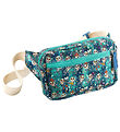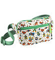 Cool Djeco bum bag with a green check pattern and with dancing skeletons. The Bum bag has green zippers with blue pendant, and it has a white strap with blue buckles.