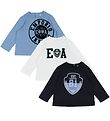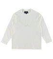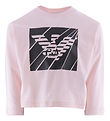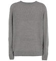 Elegant blouse from Emporio Armani in a melange grey, and on the outer right sleeve there is a wide stripe in navy with the name "Emporio Armani" in white. The Blouse is made of a finely stitched quality in a soft blend of viscose and wool, and there are decorative rib details at the shoulders.
