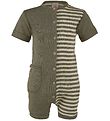 Beautiful Engel summer romper in a two-piece design, where the right side of the suit is plain dark green, and the left side of the suit is dark green- and beige striped. On the back, the suit is striped with solid colored sleeves.