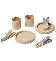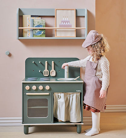 The Flexa play kitchen consists of a tabletop with four hotplates and a metal sink and a tap made of grey lacquered wood. The sink can be removed and used as a bowl. Under the plates, the heat can be adjusted with knobs with clicking sounds. Under the table there is an oven with a door that can be opened, and inside there is a plate so that bread and cakes can really be baked. Next to the oven there is a kitchen cabinet, which is hidden by a light grey curtain. The cabinet has plenty of space for pots, pans and play food. On the back wall there are holes with pins so that you can hook all the kitchen utensils on it.