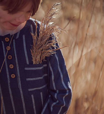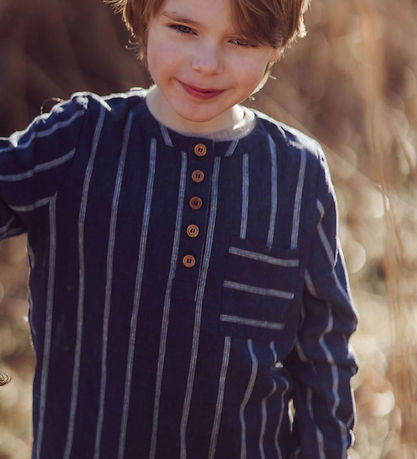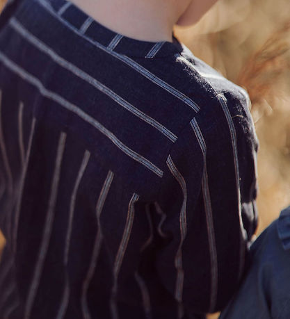 Beautiful Fliink shirt in navy blue with stripes in white and light blue. The Shirt has a collar and pull buttons at the front. It has long sleeves with a button closure at the wrist and a smart chest pocket on the left side. The Shirt is made of a light quality of viscose and linen.
