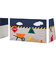 Smart Hoppekids curtains in dark blue and grey with motifs from a construction site. There are i.a. an orange wheelbarrow, a yellow work helmet and an orange cone.